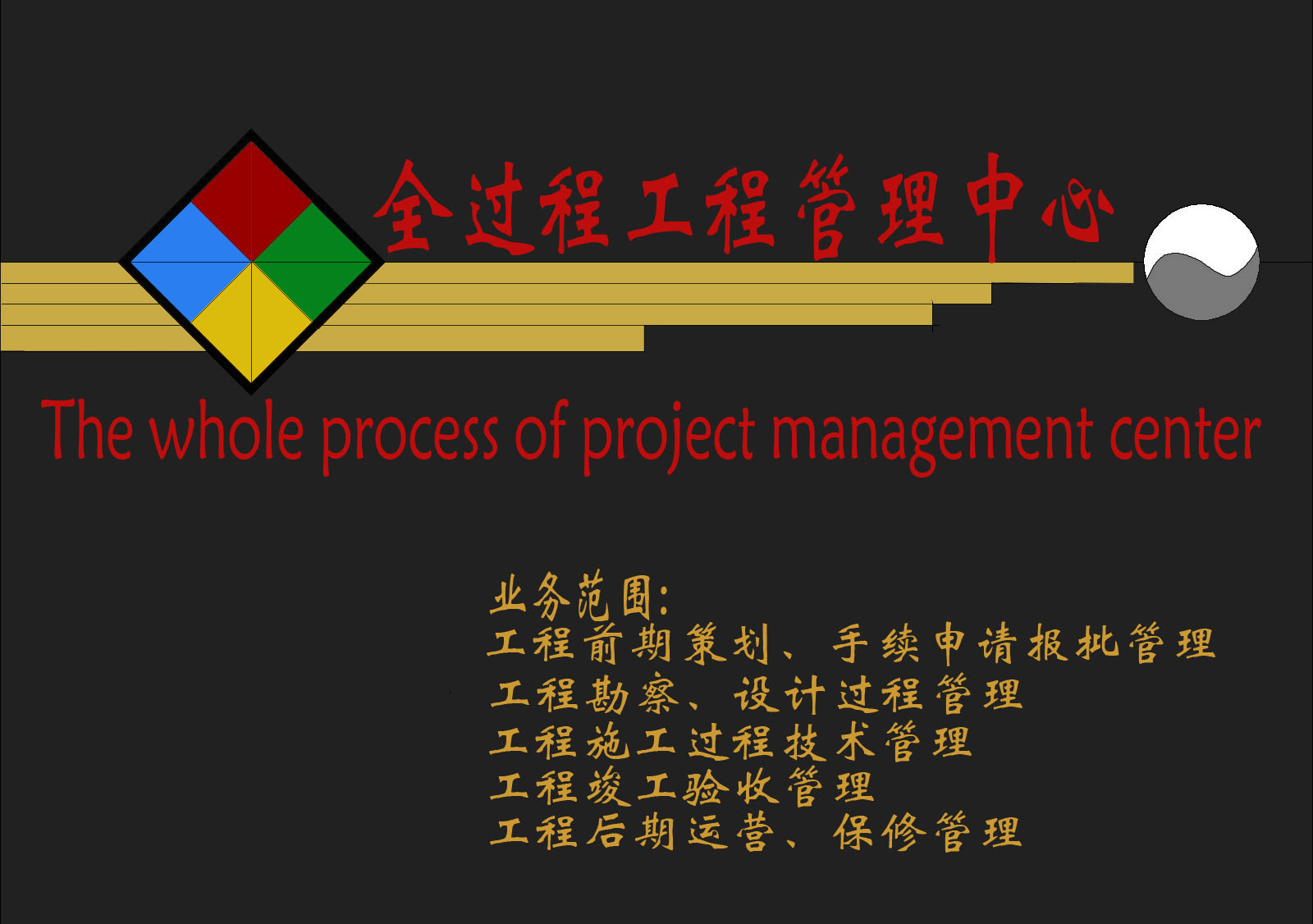 ●業(yè)務(wù)范圍:為甲方提供工程項目全過程咨詢服務(wù),包括:前期項目建議書、可行性可研報告的編制、項目實施總體策劃、報批報建管理、合約管理、地質(zhì)勘察管理、規(guī)劃和設(shè)計各個環(huán)節(jié)管理、工程監(jiān)理、施工過程的技術(shù)支持、招標代理、造價控制、驗收移交、后期運營和維護技術(shù)支持等。