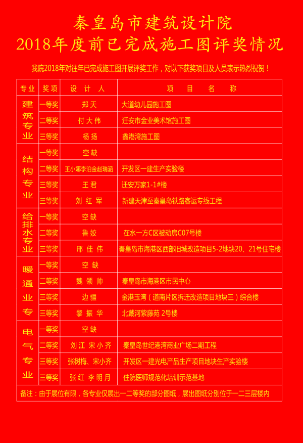 截止到2018年3月5日,活動(dòng)最終按照各專(zhuān)業(yè)分別評(píng)選出了一、二、三等獎(jiǎng),評(píng)選結(jié)果和獲獎(jiǎng)的優(yōu)秀施工圖分別在大堂進(jìn)行了公示。